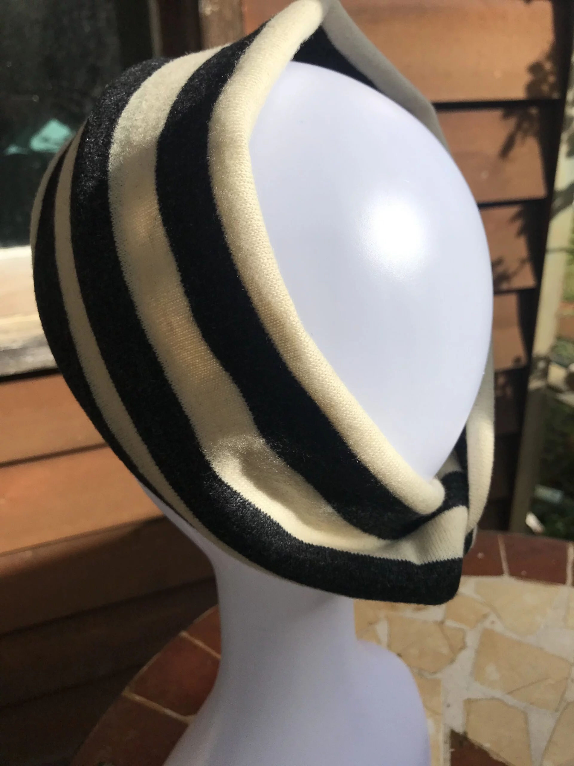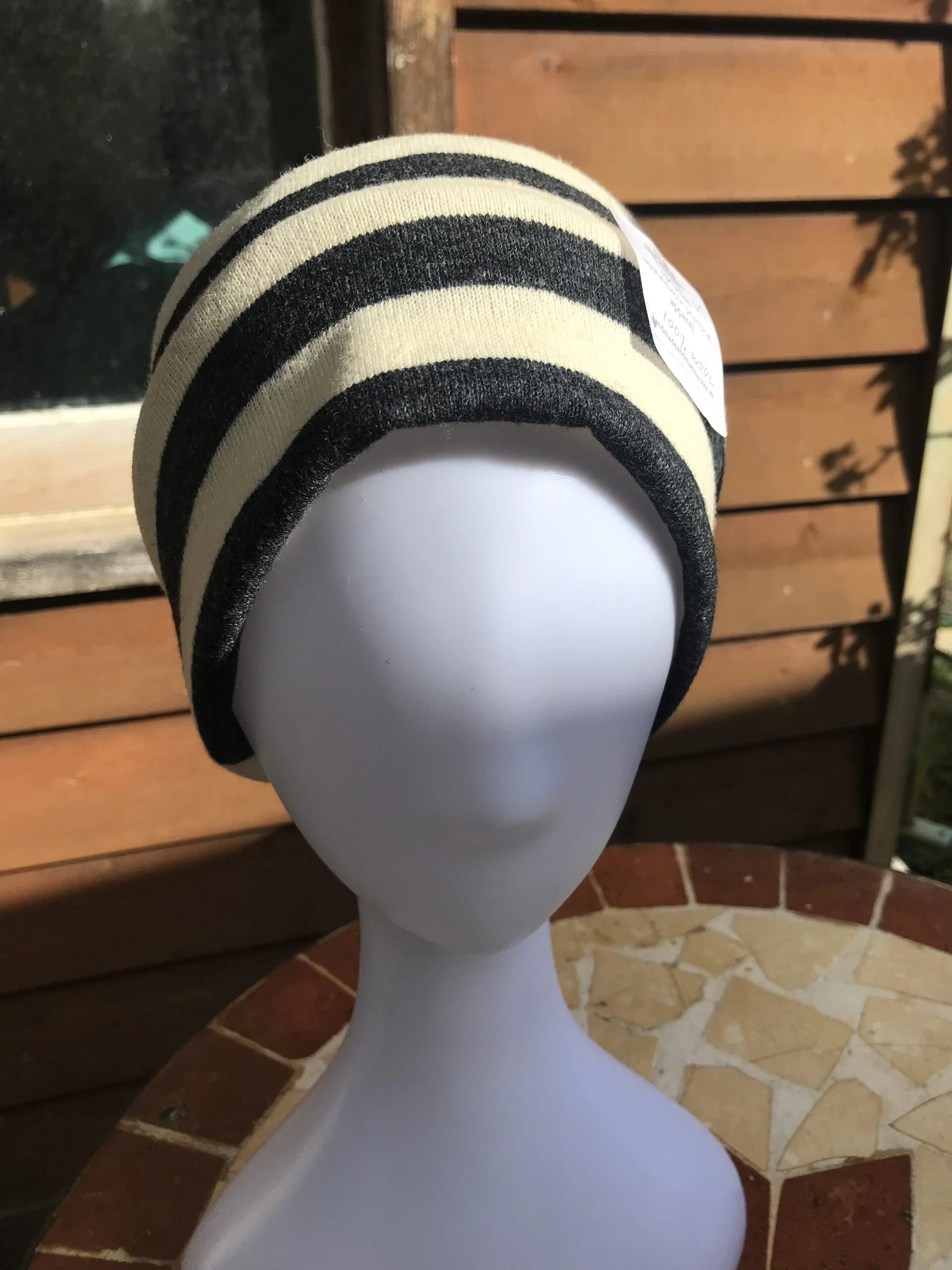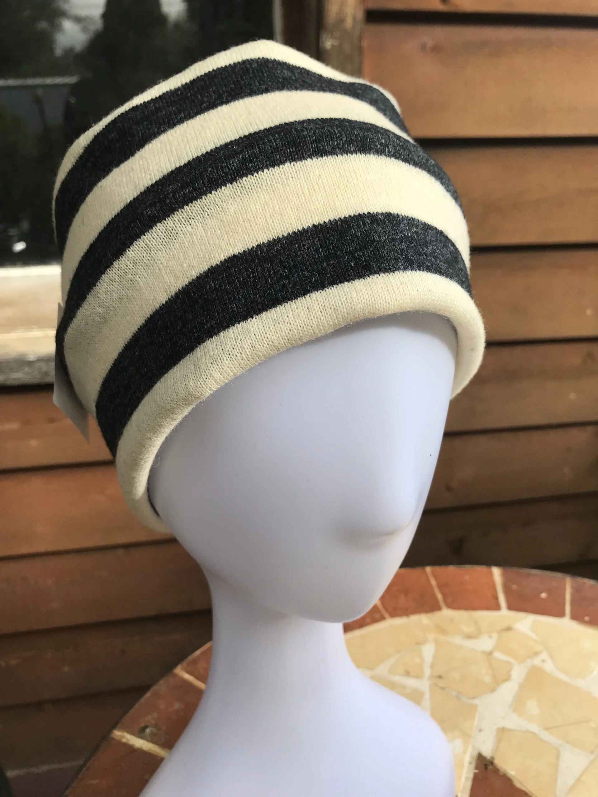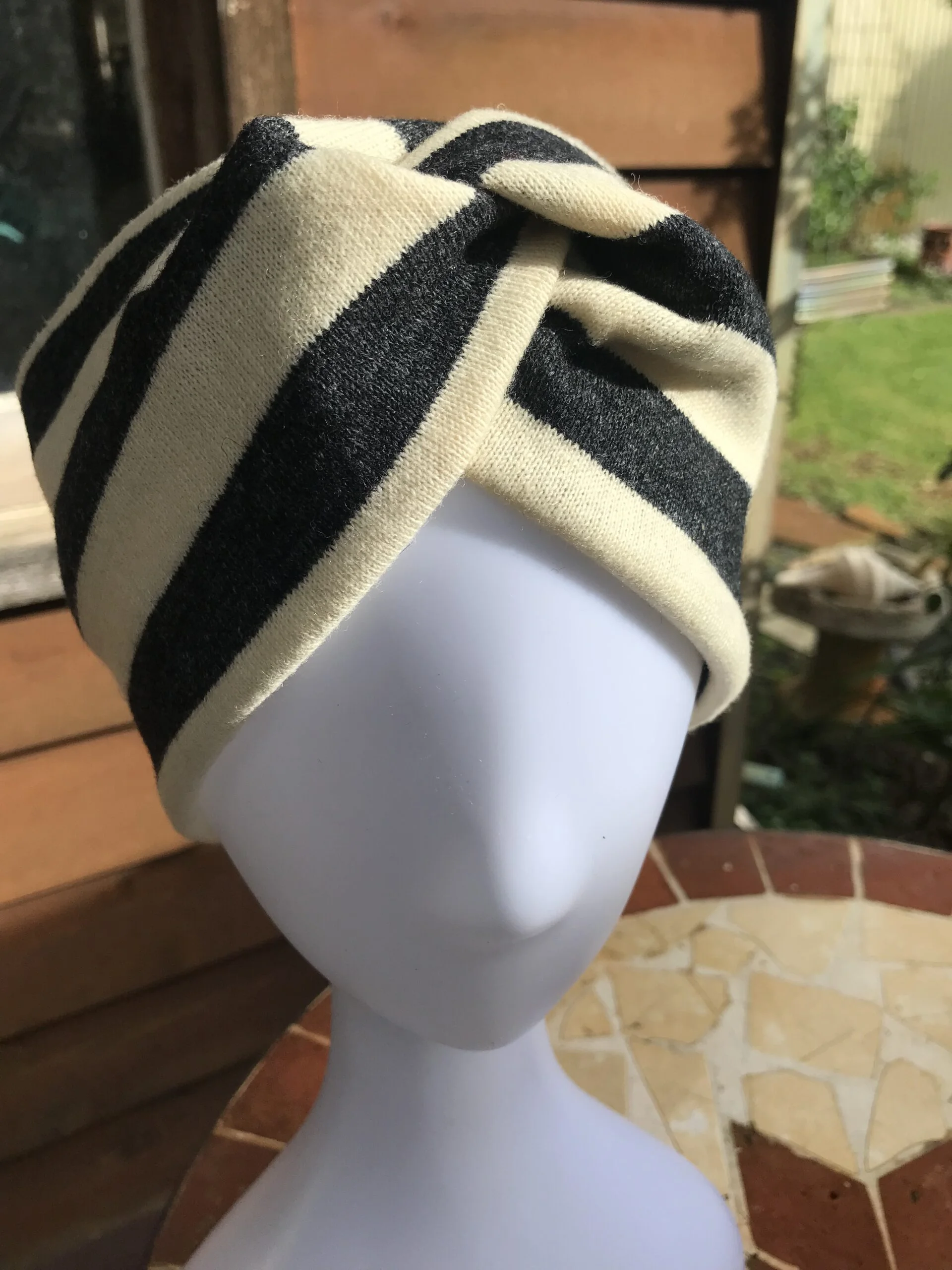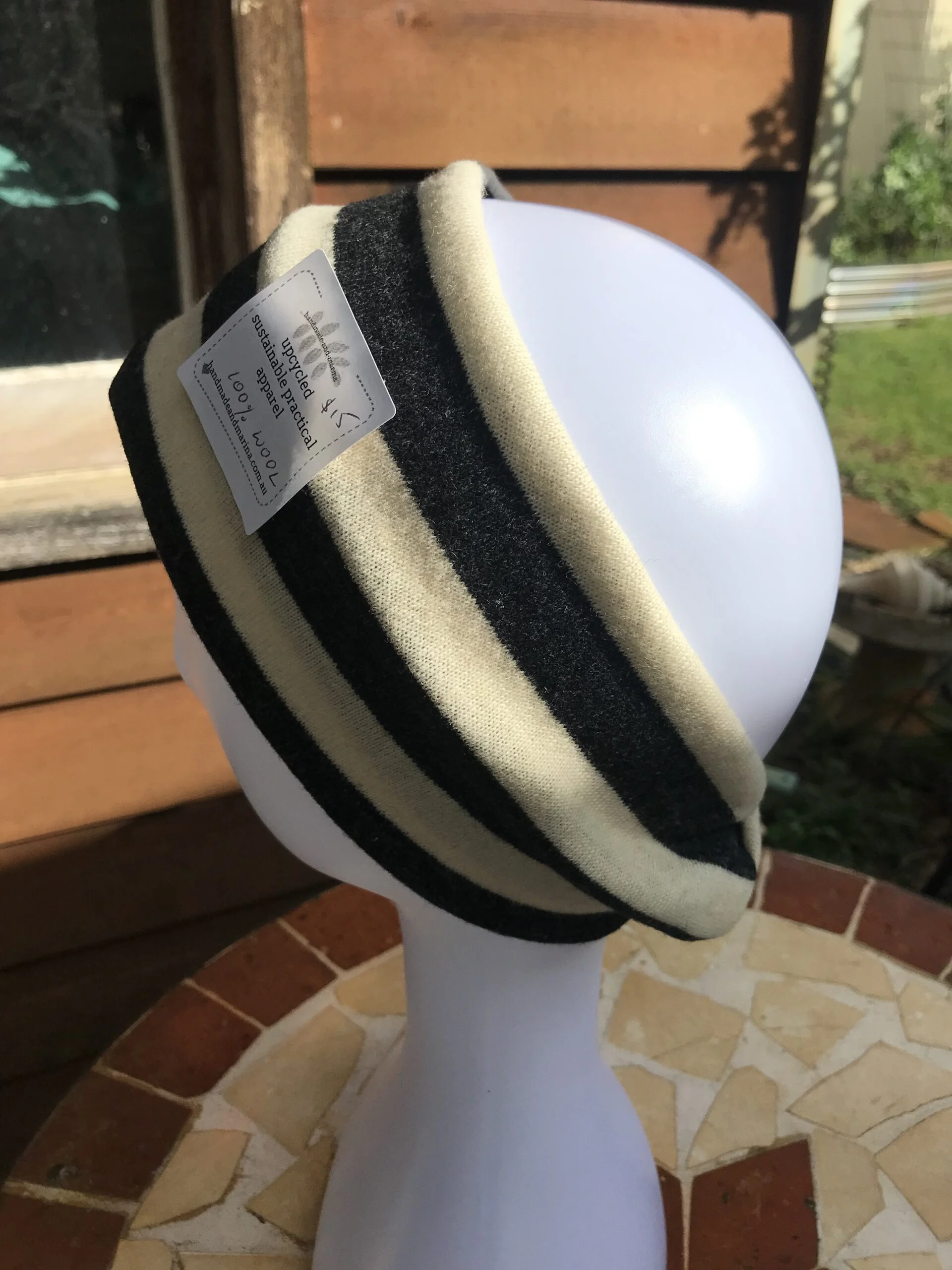 Most of the garments I have felted to ensure there is no unravelling of woollen fibres. Then I cut out patterns for beanies and fingerless mittens which come out a treat. This year I stumbled on metres of a striped woollen fabric that I knew would look great in many different ways. While I am thinking up a pattern for a skirt for me and perhaps a few cushions (the bold stripes really look fantastic over our newly upholstered couch) I’ve managed to put together some very handy headbands for the more stylish and discerning amongst us.