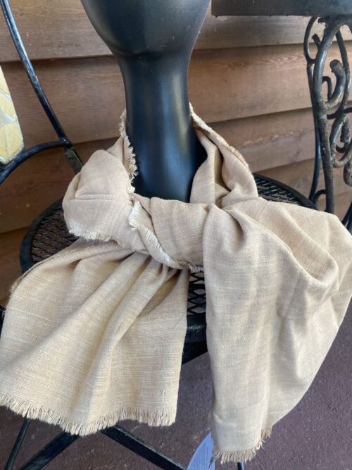 I’ve dyed this eri silk (un-dyed warp) and cotton (weft dyed turmeric) mix shawl or scarf with natural and earthy dark botanical prints.
